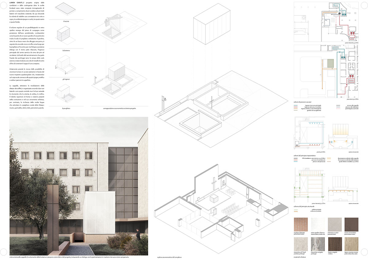 Il progetto origina dalle condizioni e dalle contingenze date: le scelte fondanti sono state compiute immaginando di portare a compimento alcuni caratteri, alcuni tratti latenti nel manufatto esistente. Da qui discende la volontà di stabilire una connessione tra sotto e sopra, tra ambiente ipogeo e suolo, tra spazio santo e spazio feriale. Il volume regolare di un parallelepipedo in vetro opalino emerge dal piano di campagna come proiezione dell’area presbiteriale, costituendosi come la quinta di un nuovo giardino il cui perimetro ricalca la sala di preghiera sottostante. Il giardino, cinto da un basso muro che alloggia una panca, è segnato da una esile croce e si offre come luogo per la preghiera e l’incontro; per morfologia e posizione dialoga con il vicino patio ribassato, l’ingresso principale del centro servizi e le cime dei pini ad occidente. Sul bordo del camminamento che guida l’ospite dai parcheggi verso la rampa della scala esterna è stata innalzata una vela di metallo brunito al fine di sostenere il ceppo di una campana.
