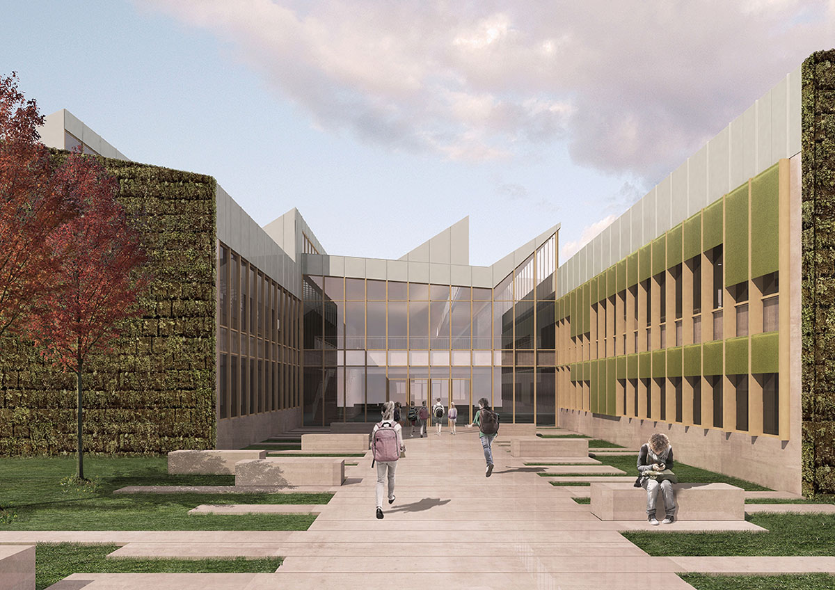 L’edificio nasce dall’assemblaggio di più corpi di fabbrica unificati da una copertura continua a falde inclinate; un “cappello tecnologico e intelligente” in grado di produrre energia, filtrare e controllare la luminosità interna, proteggere ed isolare il fabbricato.