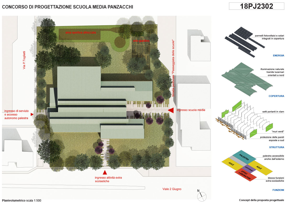 Nel volume che prospetta via 2 Giugno, in prossimità dell’ingresso “pubblico” sono pensate tutte le funzioni condivise con la città: l’ingresso all’auditorium, la biblioteca, i laboratori, gli uffici ed il ricevimento genitori.