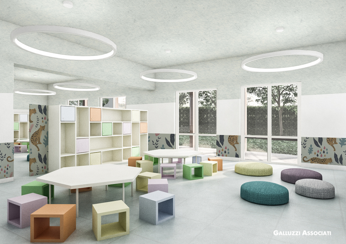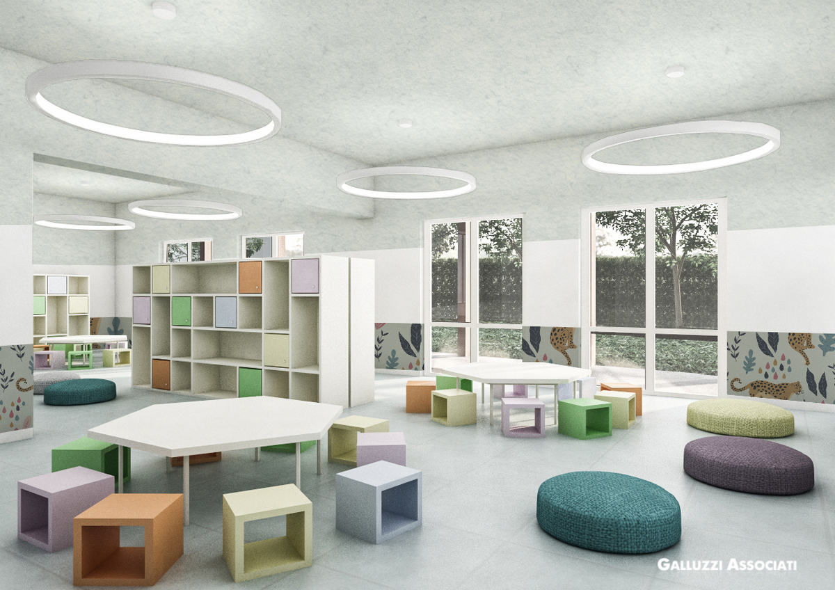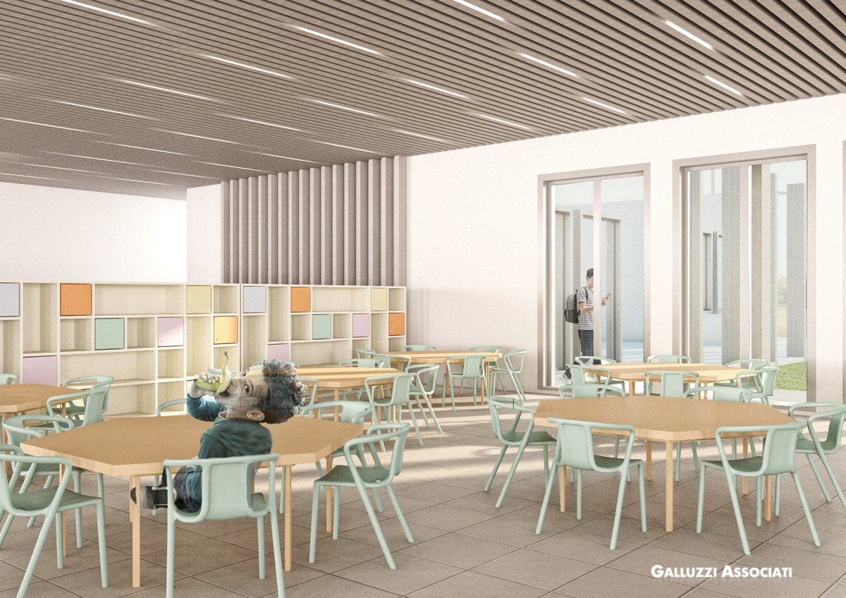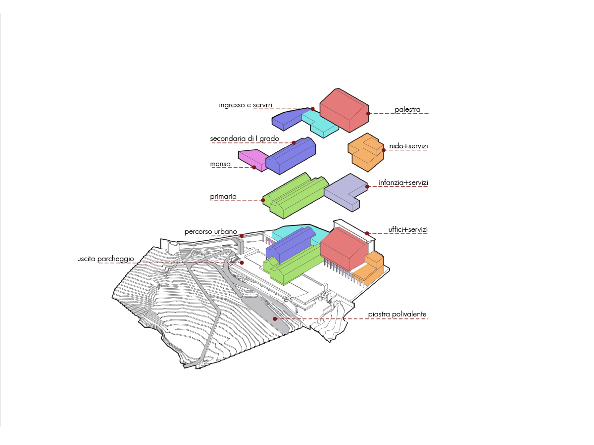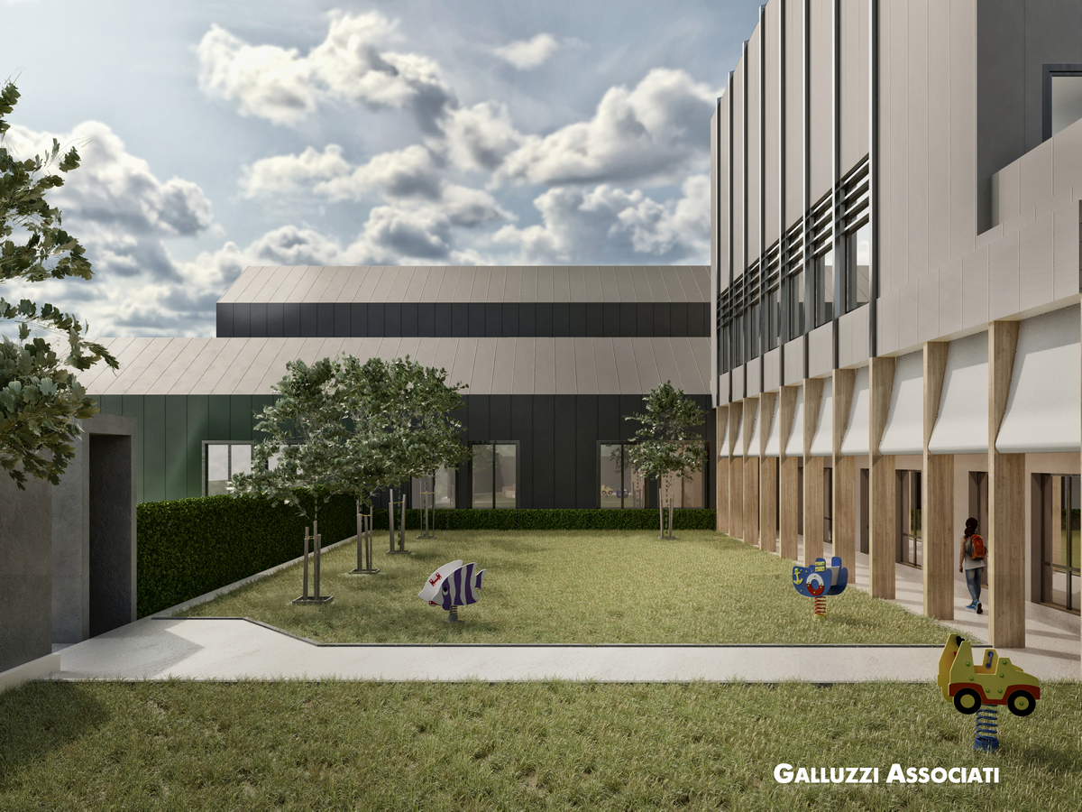 L’ingresso principale sarà a livello strada, con la scuola media e la palestra (con ingresso indipendente) situato a questo livello, insieme agli accessi alla scuola dell’infanzia e al nido. Al piano piazzale, si troveranno la scuola elementare, la scuola dell’infanzia e il nido, con tutti i servizi necessari, compresa la cucina con la mensa e ampi spazi verdi esterni.